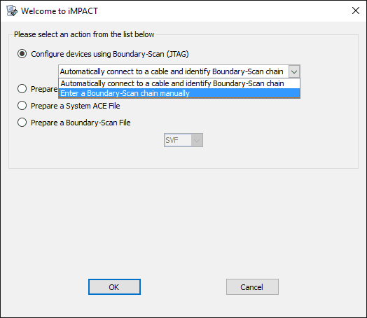 9. Open iMPACT and create a new project, or select “Yes” when iMPACT asks upon starting whether to “Automatically create and save a project”. In the dialog window select “Enter a Boundary-Scan chain manually” and click OK:Open new project in Impact
