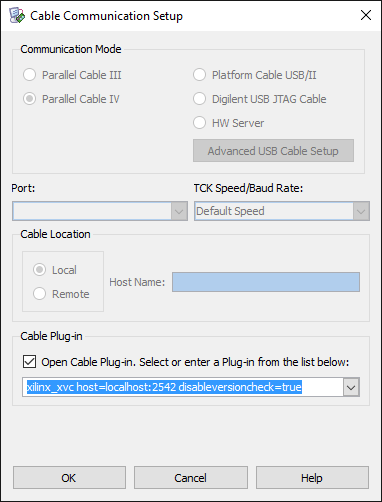 11. In the dialog window that opens, check “Open Cable Plug-in” option and enter “xilinx_xvc host=localhost:2542 disableversioncheck=true” and Click OKXVC driver setting for impact cable setup