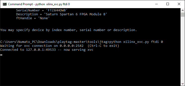 8. Now type and enter: ‘python xilinx_xvc.py ftdi 0’ Here 0 refers to Device [0] mentioned before. The output should be something like this now:server runningCongratulations, our first step is done. Server is now waiting for connections from Xilinx Virtual Cable driver. Leave this command prompt as is (i.e, don’t close it) and let’s go to iMPACT now.