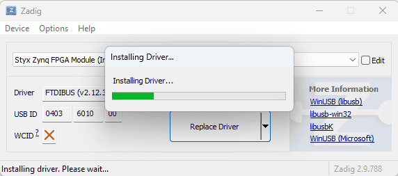 Select “WinUSB” drivers in the target driver to replace the “FTDIBUS” drivers. Click “Replace Driver” to install WinUSB drivers as follows.