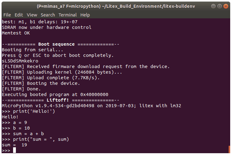 Congratulations, you’ve successfully run MicroPython on the Mimas A7 board using the LiteX Build Environment!