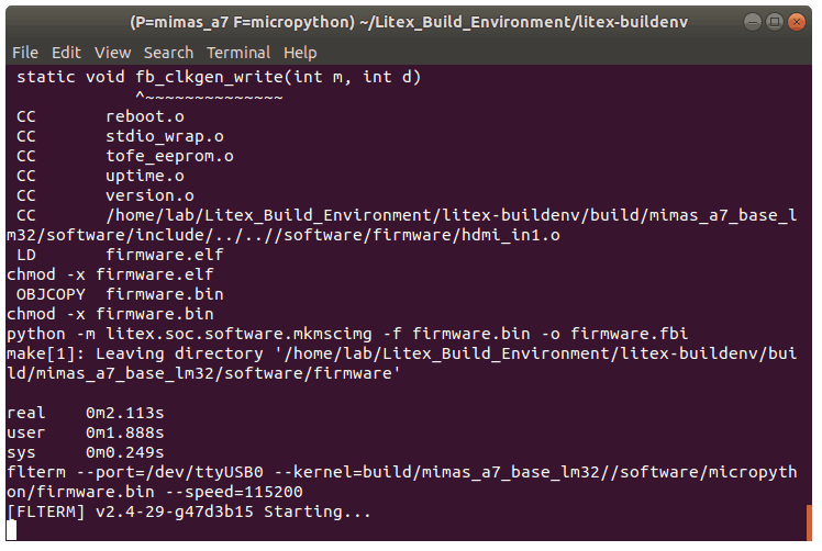 We need to generate the MicroPython firmware which runs on the soft CPU implemented inside FPGA. The LiteX Build Environment has a MicroPython script file that generates this MicroPython firmware. To generate MicroPython firmware, run: