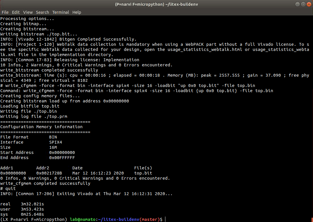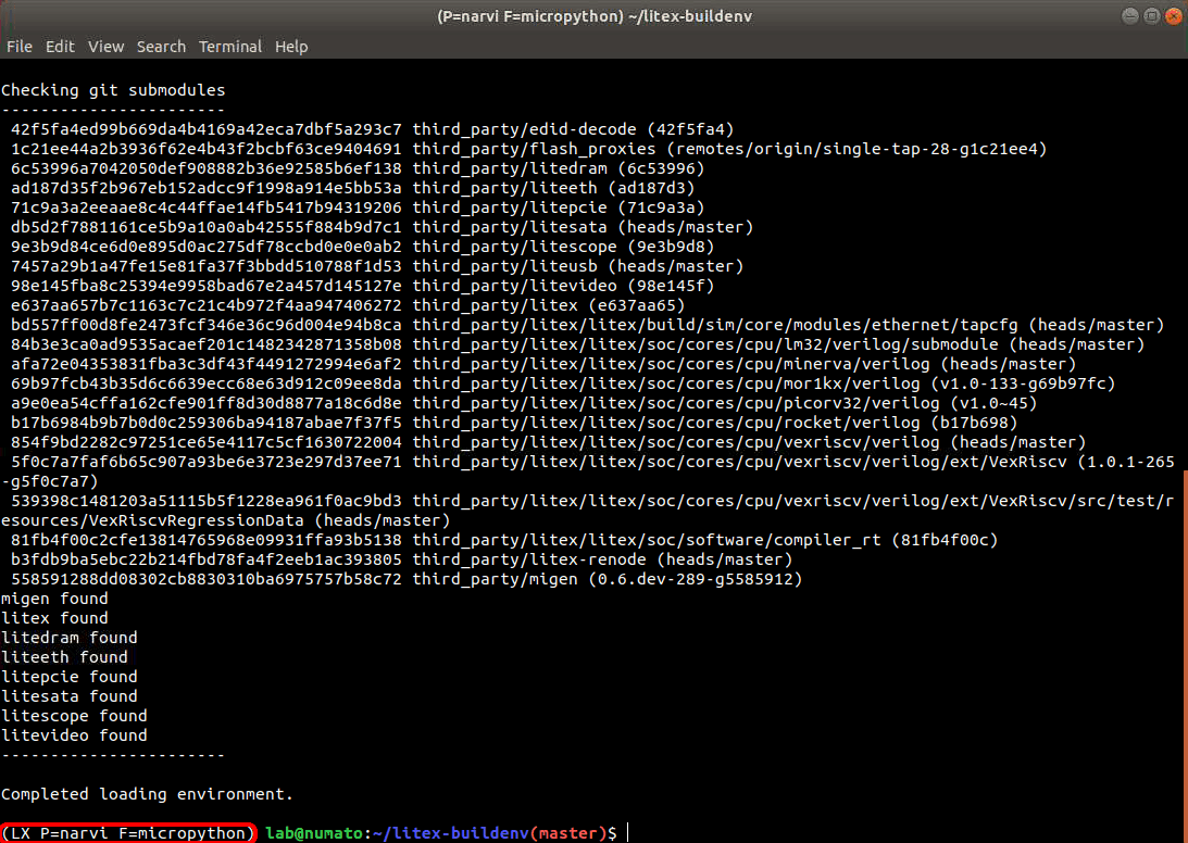 All the steps are to be executed in a Linux system. Open Linux Terminal and follow the steps to create hardware/gateware, MicroPython firmware and to run them on Narvi. Screenshots are added wherever possible to help the reader to follow the steps.