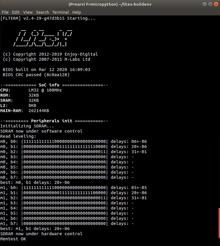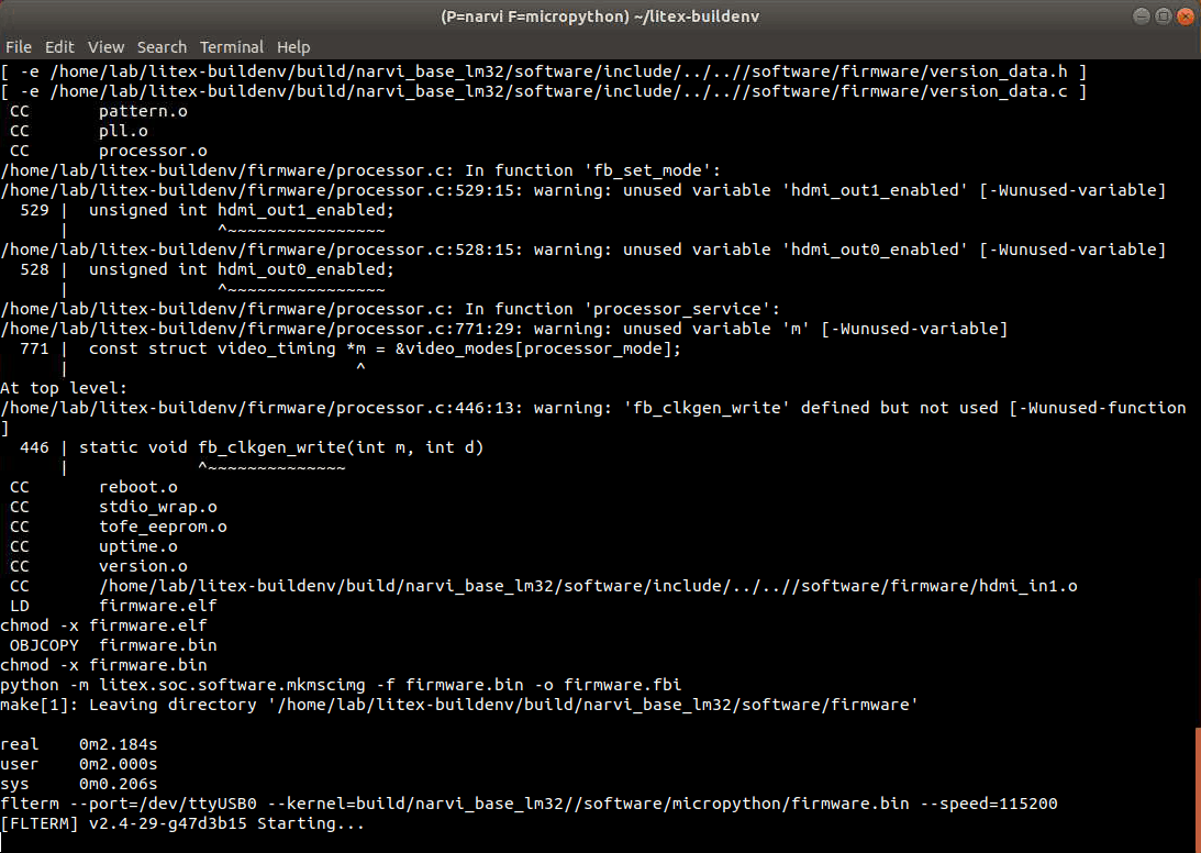 We need to generate the MicroPython firmware to load it on the soft CPU. The LiteX Build Environment has a MicroPython script file that generates the MicroPython firmware. To generate it run the build-micropython.sh shell file by executing the command:
