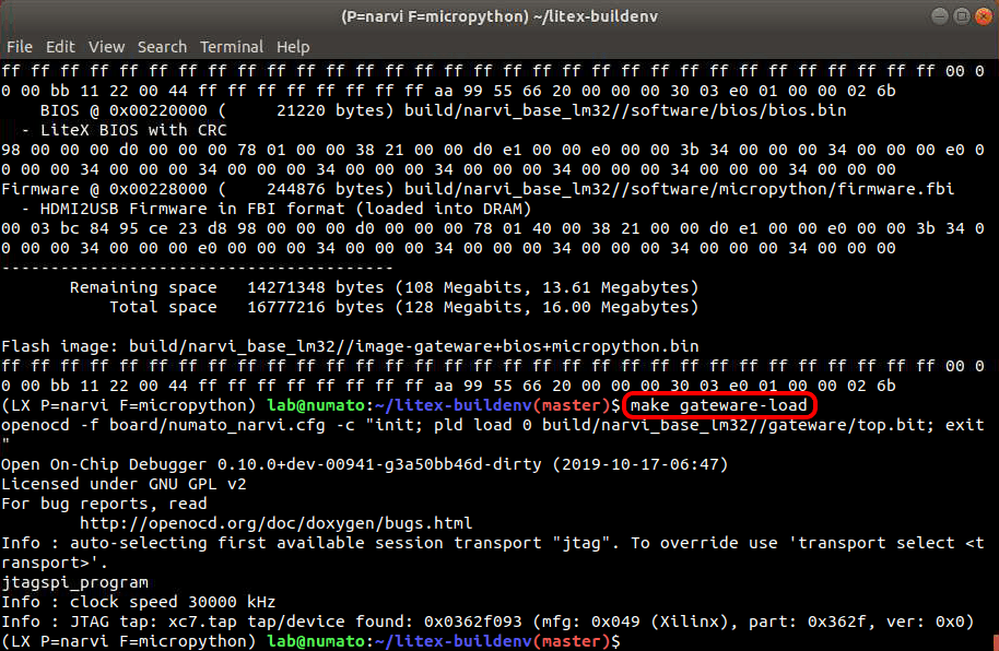 We can see the FLTERM tool “Starting” that connects with Narvi using /dev/ttyUSB. Load the gateware by executing the following command in the older terminal window.