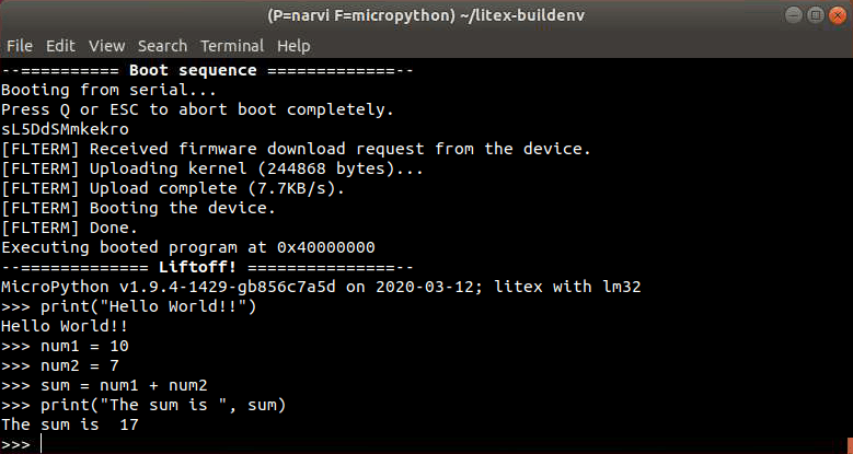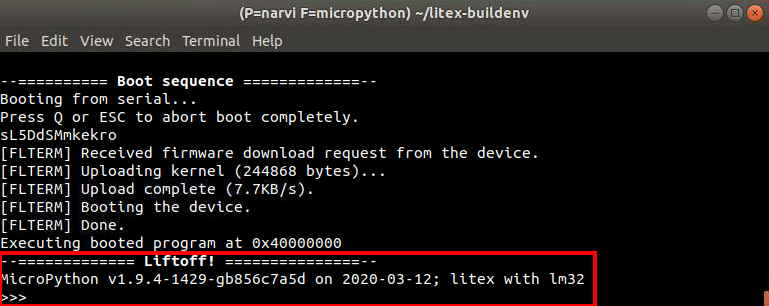 If the environment is set up correctly, then the terminal should show something like "(LX P=narvi F=micropython) #" similar to the image below.