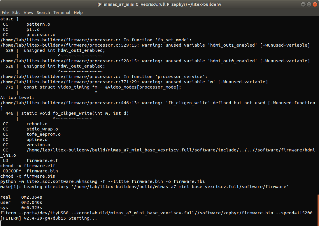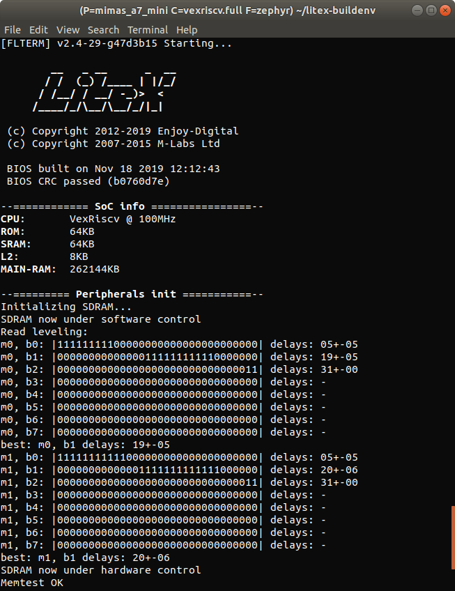 export PLATFORM=mimas_a7_mini CPU=vexriscv CPU_VARIANT=full TARGET=base FIRMWARE=zephyr