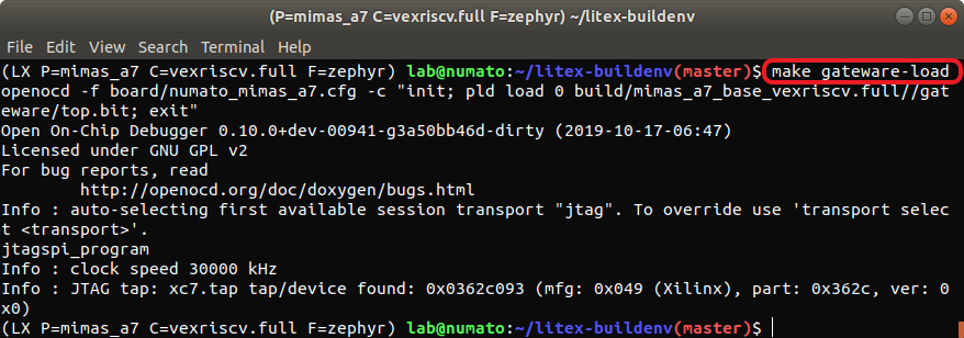 Once the gateware and firmware have been generated, the next step is to load the generated gateware and firmware to the Mimas A7 board. Connect the Mimas A7 board to the host system using a USB 2.0 Type-B cable. Open a new terminal window (keeping the existing terminal shell as it is, it will be used later) and enter into the litex-buildenv environment exactly as described in Step 2. Next, enter the following command in this new terminal to load the Zephyr firmware.