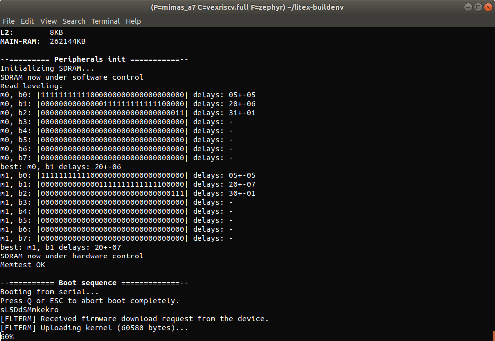After loading the gateware into the FPGA on Mimas A7, the second terminal should start uploading the Zephyr RTOS firmware to the Vexriscv soft CPU running on the Mimas A7. The image below shows the RTOS Zephyr firmware loading on to soft CPU.