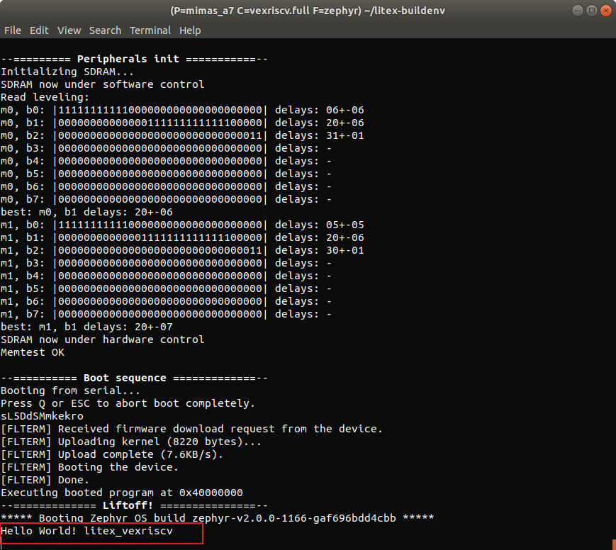 Congratulations on getting the Zephyr OS running successfully on the Vexriscv RISC-V CPU built with LiteX on your Mimas A7 FPGA Development Board!