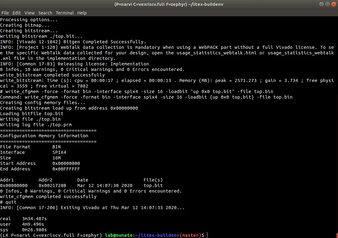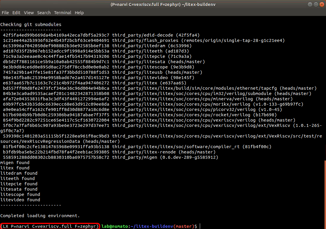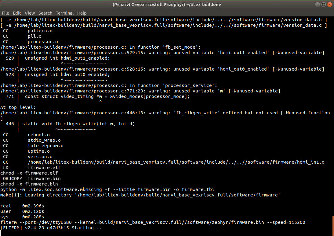 The Litex Build Environment available from our repo comes with Narvi platform support. We are going to deploy LiteX SoC with the VexRiscv CPU on Narvi, so choose CPU as “vexriscv” and CPU variant as “full” to enable all features of the CPU. The litex-buildenv supports many different firmware options such as bare-metal, Linux, MicroPython, Zephyr, etc. For this article, we select FIRMWARE=zephyr.