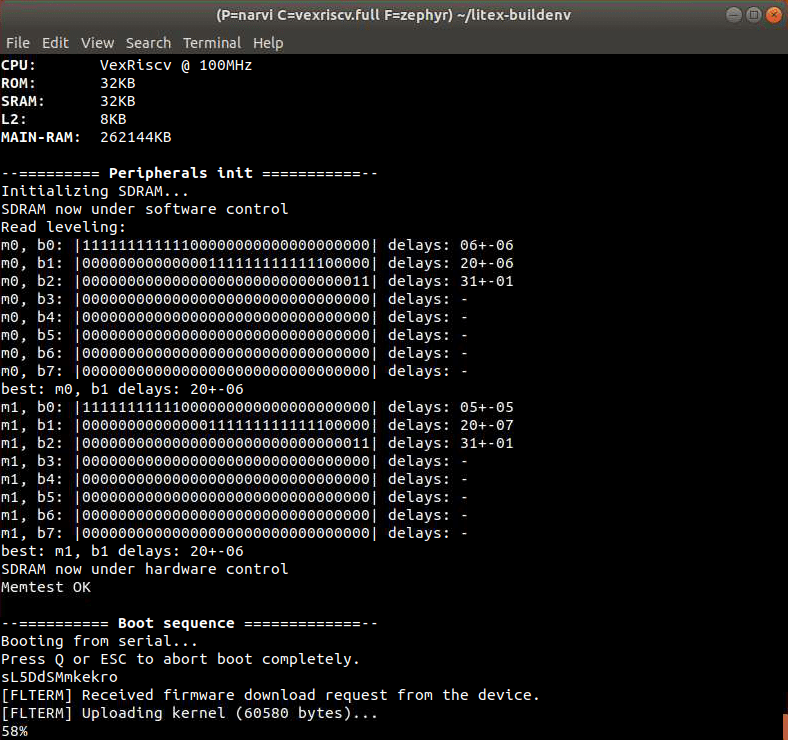 After loading the gateware into the FPGA on Narvi, the second terminal should start uploading the Zephyr RTOS firmware to the Vexriscv soft CPU running on the Narvi. The image below shows the RTOS Zephyr firmware loading on to soft CPU.