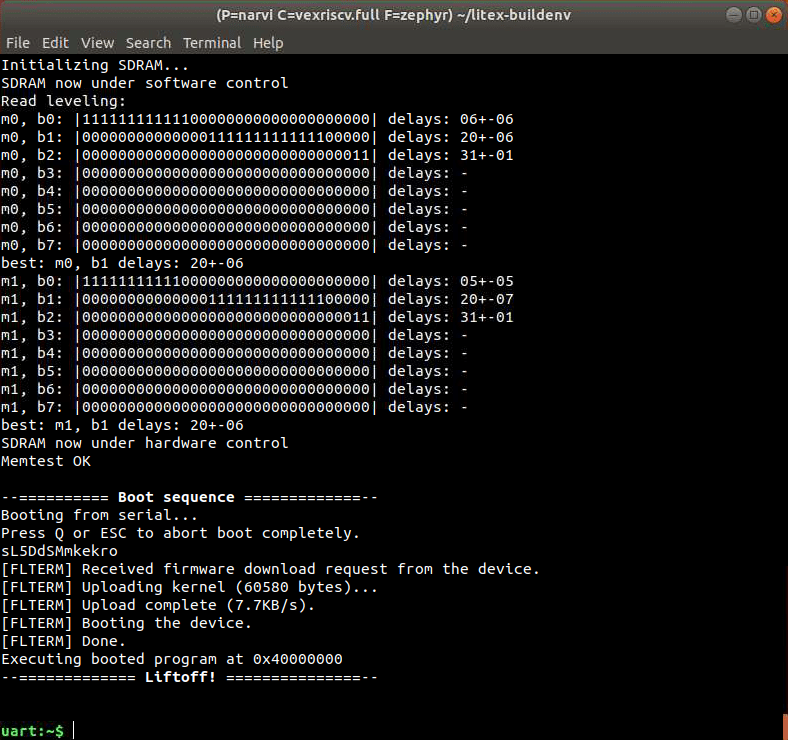Congratulations on getting the Zephyr OS running successfully on the Vexriscv RISC-V CPU built with LiteX on your Narvi Spartan 7 FPGA Module.