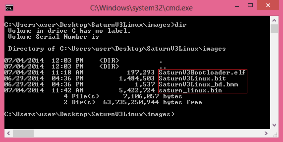 If the command ran successfully, you will see a new file created in the directory with name “SaturnV3Linux_rp.bit”. This file now has both the FPGA configuration stream and Bootloader code.