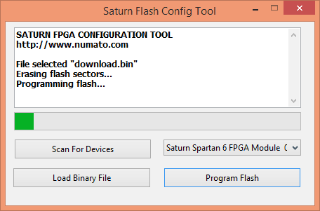 Now download the latest Saturn Spartan 6 FPGA Module configuration tool from the product page and use that to download the final binary image “download.bin” to the SPI flash (see image below).
