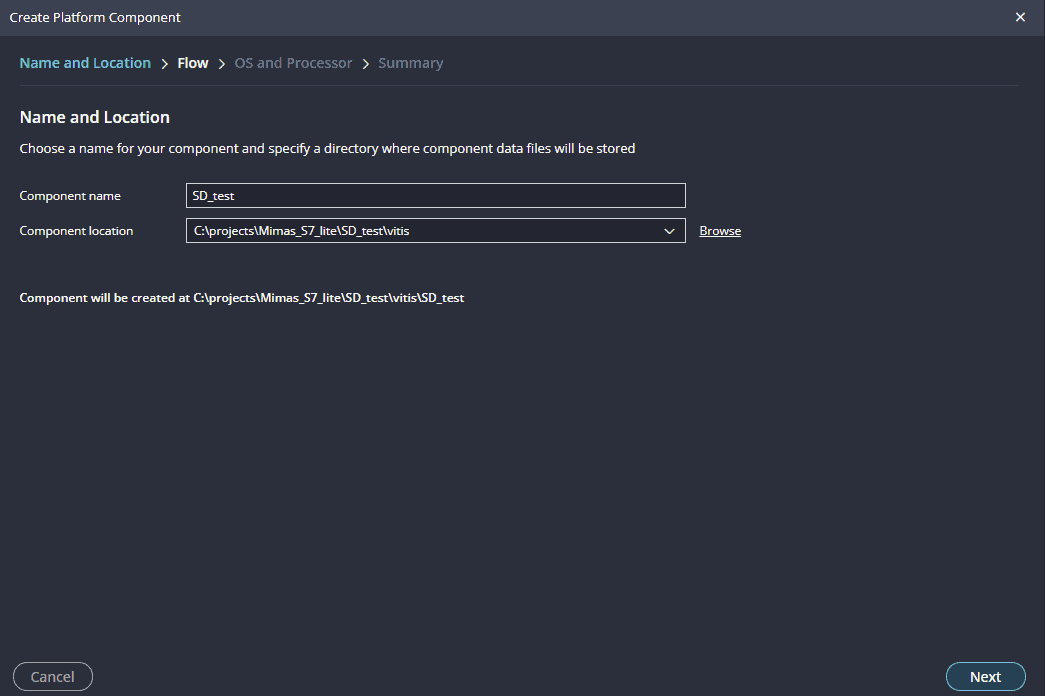 Create a new platform for the project, by selecting “Create Platform Component”, click “Next”, in the Flow tab select the XSA file saved using the step 20 and finally click “Next” and “Finish” respectively.