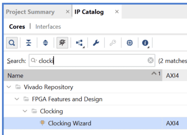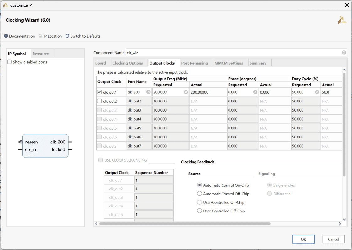 Search for “Clocking Wizard” IP and double-click on it to customize. Choose component name as “clk_wiz”, select “CLK_IN1” board interface to ‘sys_clock’ and “EXT_RESET_IN” to ‘reset’ in the “Board” tab. In “Clocking Options” choose primary clock port name as “clk_in”, clk_out1 port name as “clk_200”, requested frequency as “200.000”, de-select locked signal and select “Reset Type” as “Active Low”. Click “OK”.
