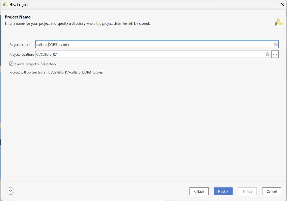 Type in a project name, select a convenient project location and select “Create project subdirectory” to keep all project files in single folder. In this article, author has used “callisto_ddr3_tutorial” as a project name. Click “Next”, select “RTL Project” as project type and select “Do not specify sources at this time”. Click “Next” to proceed.