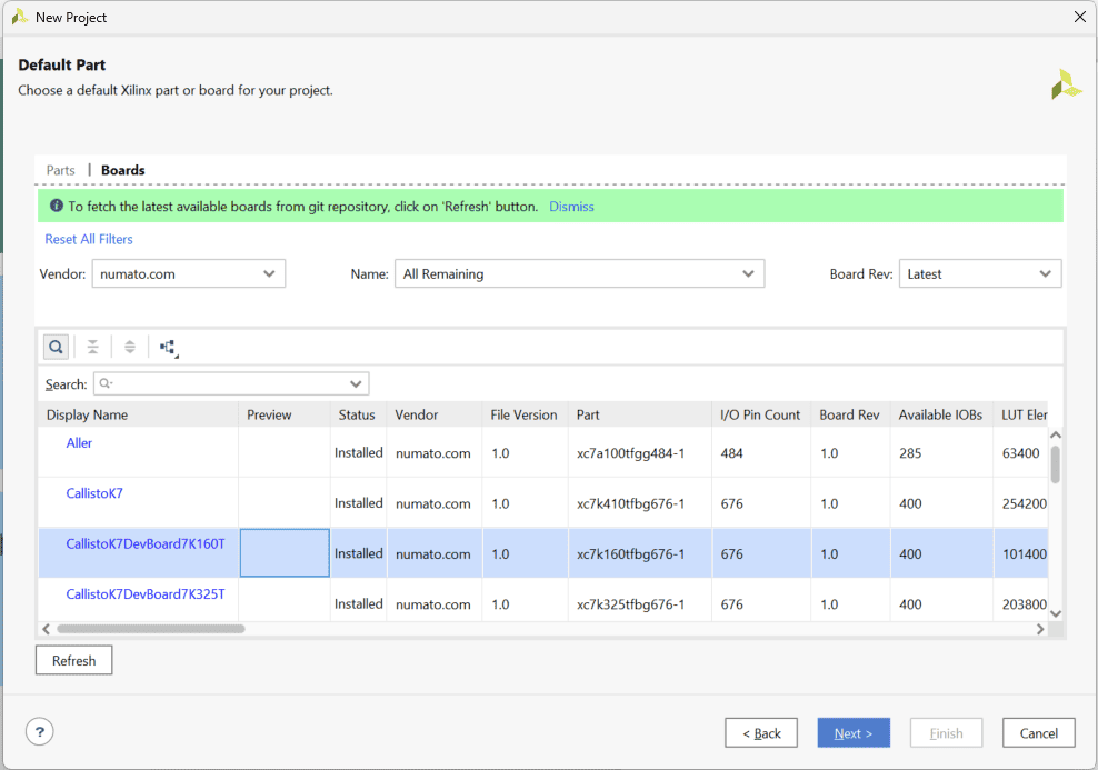 Select “Boards” from “Default Part” tab, choose “numato.com” as a Vendor. Select “CallistoK7” (make sure you select correct part number according to your board) and click “Next”. If Callisto K7 is not listed, make sure board support files are installed correctly. Click “Finish”. A new Vivado project will open with the selected settings.