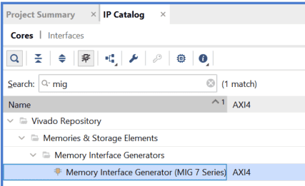 Under the “Flow Navigator”, double-click on “IP Catalogue” to add necessary IP cores. Search for MIG 7 and double click on “Memory Interface Generator (MIG 7 Series)” to customize.