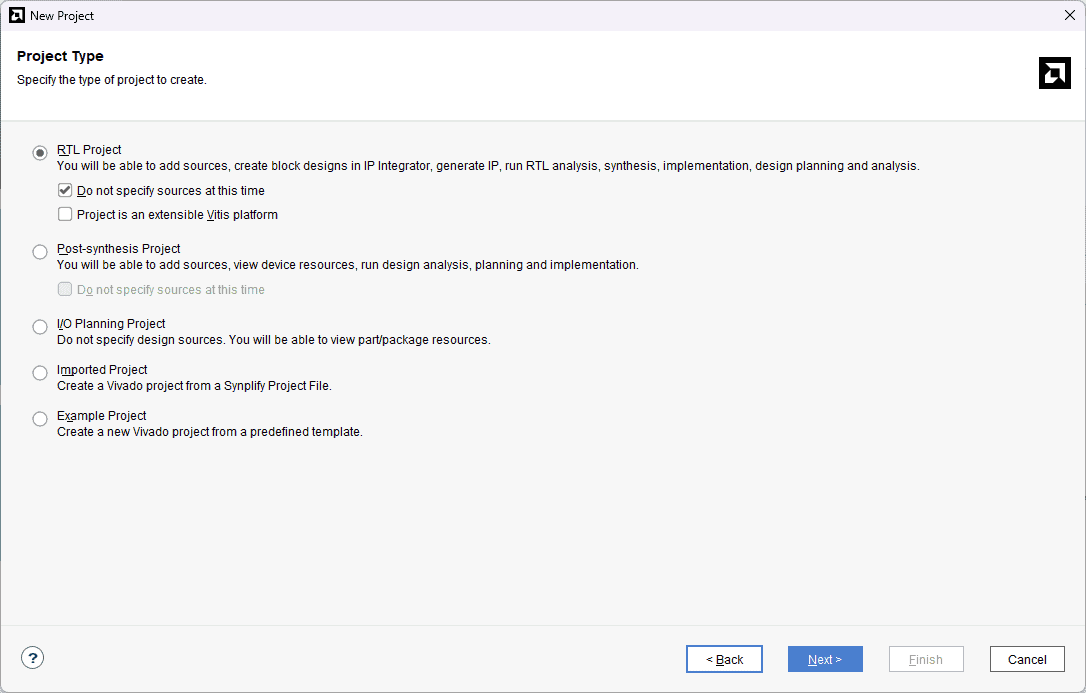 Choose “RTL Project” as project type and check the option “Do not specify sources at this time”.