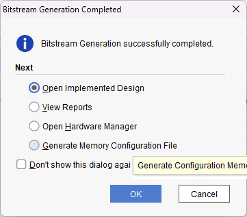 Once the bitstream is successfully generated, close any “Bitstream Generation Completed” dialog which comes up asking for what to do next.