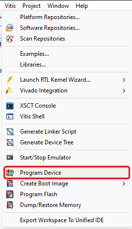 Program the board by selecting Vitis -> Program Device -> Program. Click Program in the window that opens up.