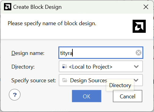 Under Flow Navigator, select “Create Block Design” in IP Integrator. Give an appropriate name to design. We will call it “tityra” for example.
