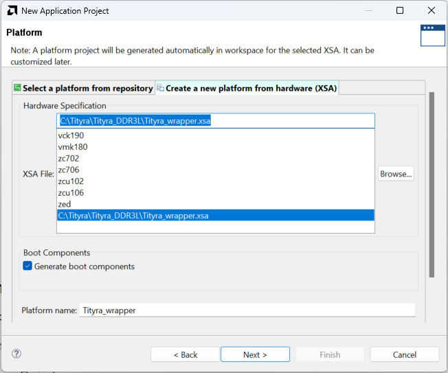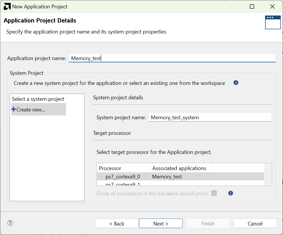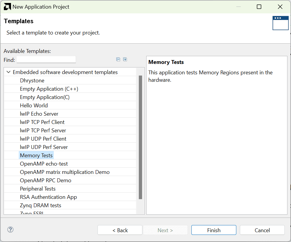 To create a new platform for the project, select “create a new platform from hardware (XSA)” and select the XSA file saved using the step 14. Type in a project name, leave other options as default and click “Next”. In the next window, select “Memory Tests” template and click “Finish”.