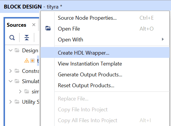 Go to “Sources” tab, right click on “tityra” design file and select “Create HDL Wrapper”. Click OK on the window that appears to finish generating wrapper.
