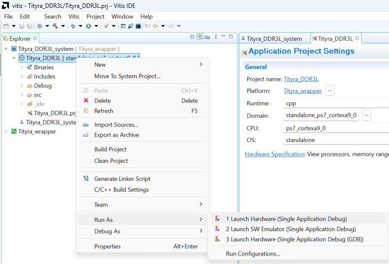 After FPGA is successfully programmed, right click on the executable .elf file of our Memory test program, go to Run As -> 1 Launch on Hardware (Single Application Debug), as shown in image below: