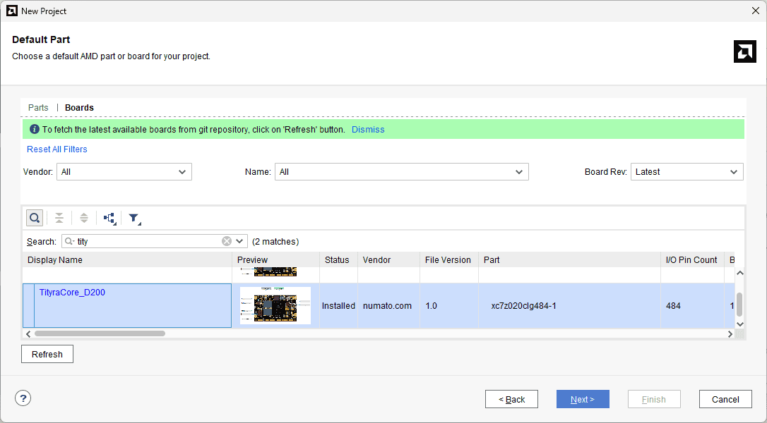 At the “Default Part” step, select “Boards” and choose Vendor as “numato.com”. Select “TityraCore_D-262” and click “Next”. If TityraCore is not displayed in the boards list, you will need to install the board support files correctly.