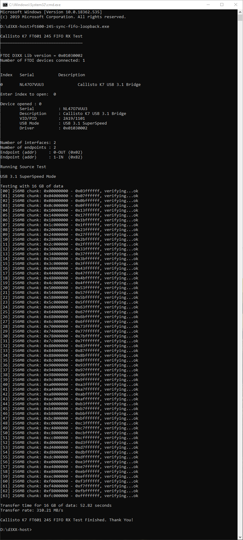 After running the executable file, the FT601 device detects and the FT601 device will read the 16GB of data from the Host device as shown in the image below.