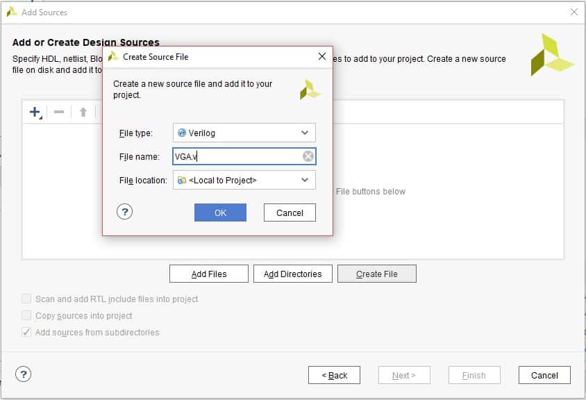 Click Next. In ‘Add or Create Design Sources’, select ‘Create File’, give ‘VGA.v’ as file name. Click OK and Finish.