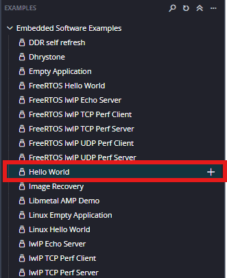 After fsbl project is created, the next step is to create a ‘Hello World’ application in the same way as fsbl application project. By selecting the “Hello World ” template from the “examples”, select “Create Application Component from Template”, specify project name and location, click “Next”, select newly created platform, click “Next” and then finally “Finish”.