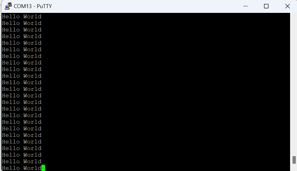 Open any serial terminal (such as PuTTY) and connect to the COM Port corresponding to Styx at 115200 baudrate. If everything went well, Styx should boot up from SD card and print “Hello World” repeatedly over USB-UART on the serial terminal application.