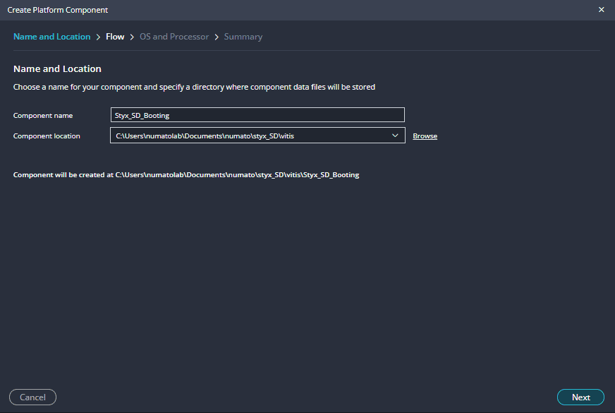 Create a new platform for the project, by selecting “Create Platform Component”, click “Next”, in the Flow tab select the XSA file saved using the step 14 and finally click “Next” and “Finish” respectively.