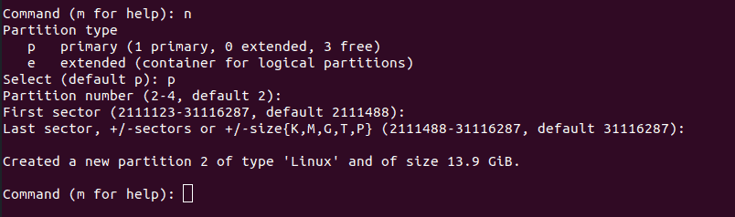 To create the first partition, enter “n” in the terminal, followed by selecting the partition type as primary (p), and then press “Enter” twice. It is recommended to allocate at least 1GB of space based on your requirements. In this example, the value “2111122” is provided as the last sector value, which will result in the creation of partition 1 with a size of 1 GB.