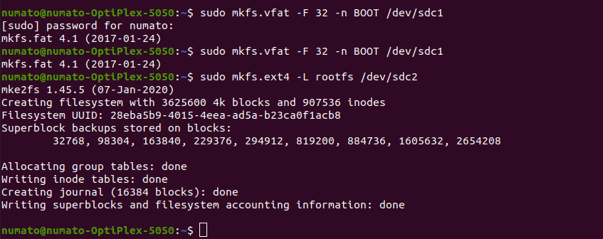 We need to assign name and format for each partition. The first partition is designated for the boot and will be formatted with the FAT file system, while the second partition is intended for the root file system and will utilize the EXT4 file system. For this purpose, you can use the following commands in the terminal.