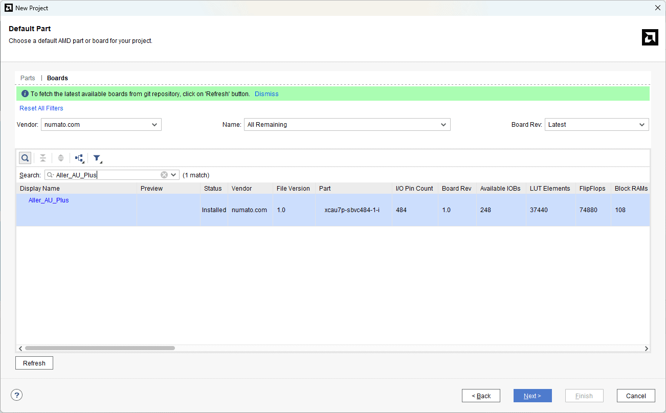 In the “Default Part” window, select the “Boards” tab. Choose the Vendor as “numato.com”, filter the Name “Aller_AU_Plus” and select the board as shown below. If Aller_AU_Plus is not displayed in the Boards list, make sure that the board support files are installed correctly.