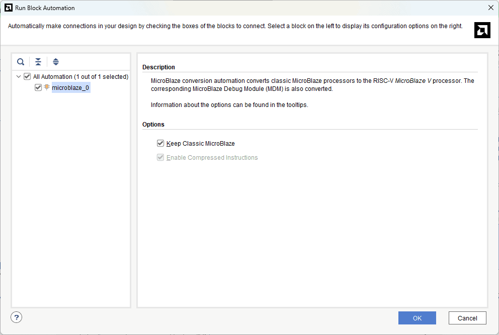 Click “OK” for Vivado to automatically configure the blocks for you. In Vivado 2024.1 after clicking on “OK” a window will appear, here you need to select “Keep Classic MicroBlaze” and then click OK to use Microblaze.