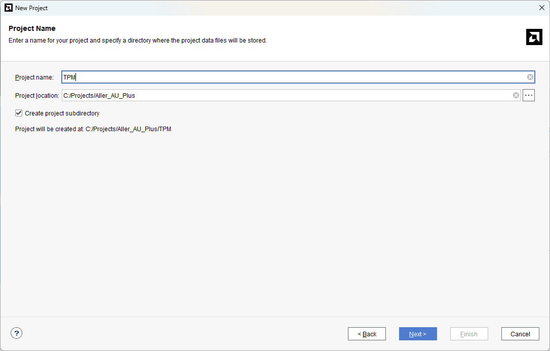 In the “Project Name” window, enter a name for the project and save it at a suitable location. Select the option “Create project subdirectory” to keep all the project files in a single folder and click “Next” without making any changes until you see the “Default Part” page.