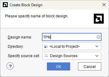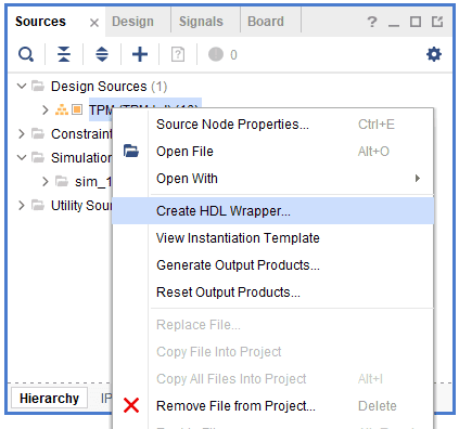 Right-click “TPM_i” in the “Sources” window, and select “Create HDL Wrapper” from the popup menu. Click “OK” on the window that appears to finish generating a wrapper.