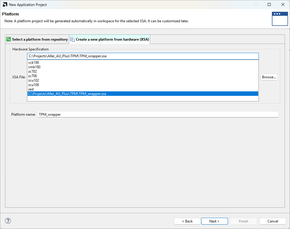 In the Platform window, select Create a new platform from hardware tab and import the XSA file which is already created (Provide XSA file location). Click Next.