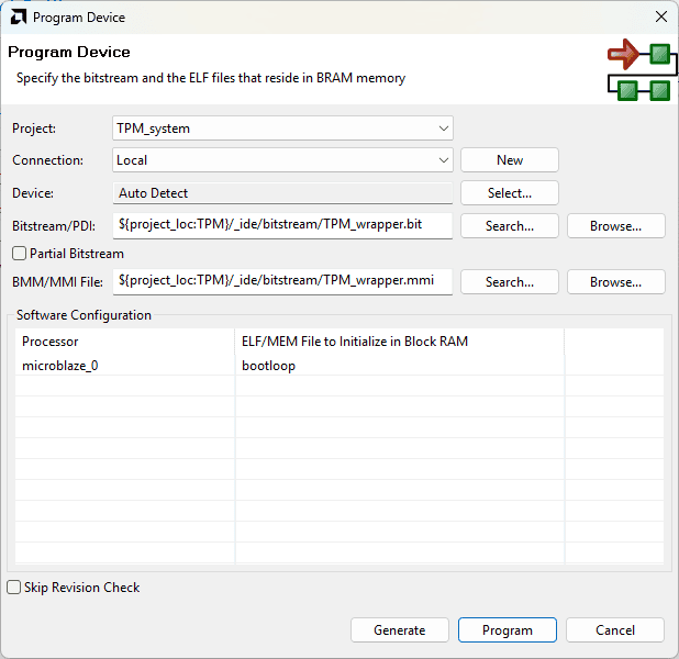 Click “Generate Bitstream” under the “Program And Debug” section to synthesize, implement and generate a bitstream.