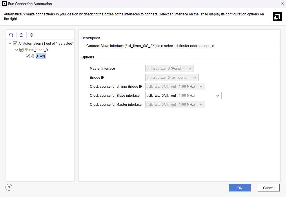 Add AXI Timer into IPI Canvas and click Run Connection Automation.