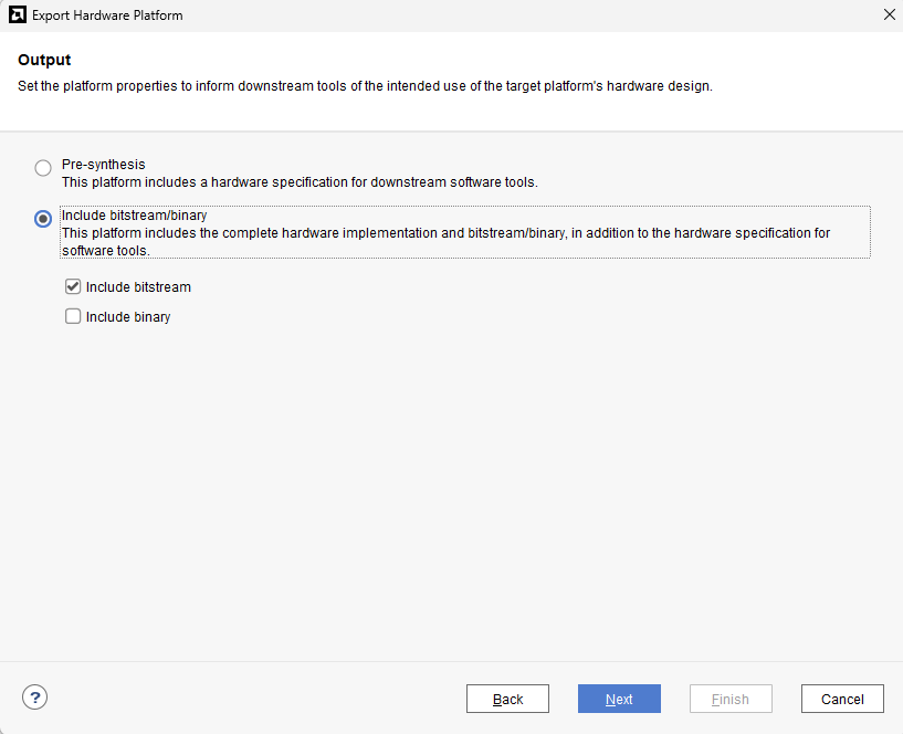 After generating the bitstream successfully, select Export -> Export Hardware from the File menu. Click Next.