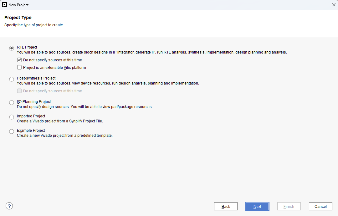 In the Project Type window, select RTL Project and check the “Do not specify sources at this time” option. Click Next.