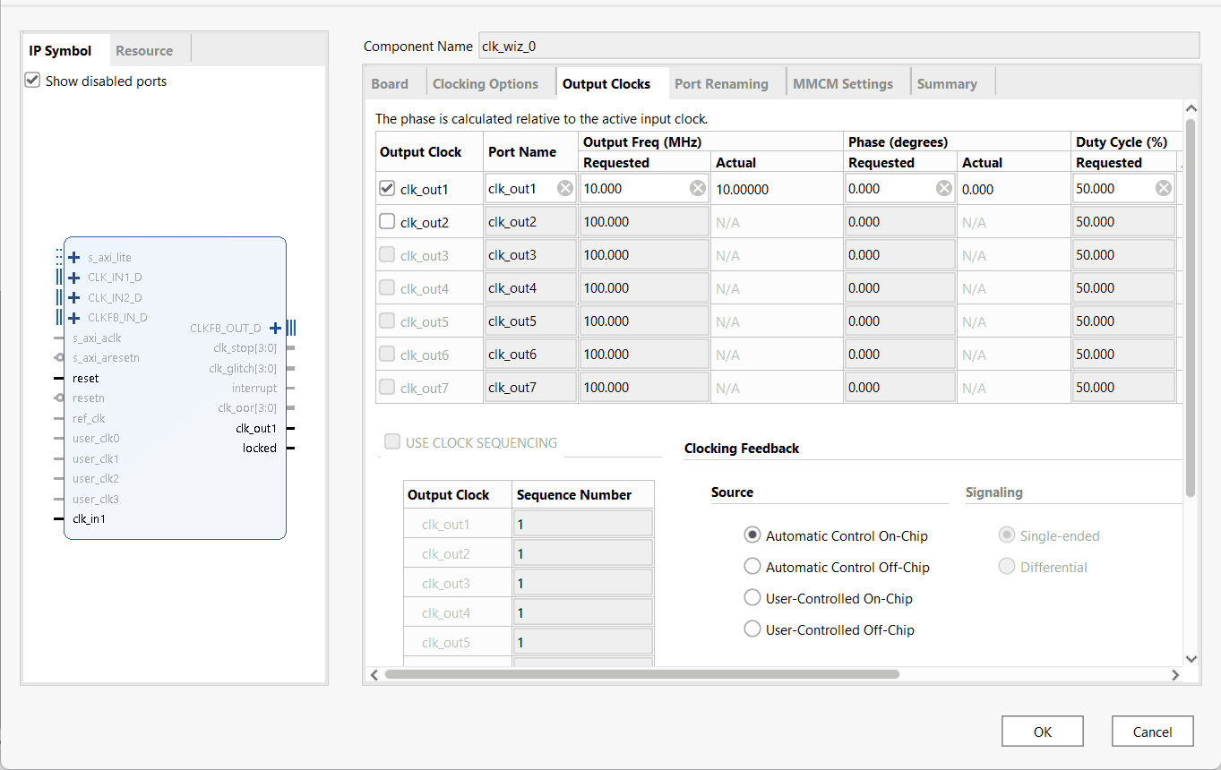 In Output Clocks tab, Provide clk_out1 value as 10MHz and Click OK.