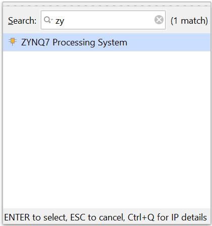 Go to Diagram window, right click and select “Add IP” from the popup menu. Search for ZYNQ7 Processing System. Add it to block design by double clicking.